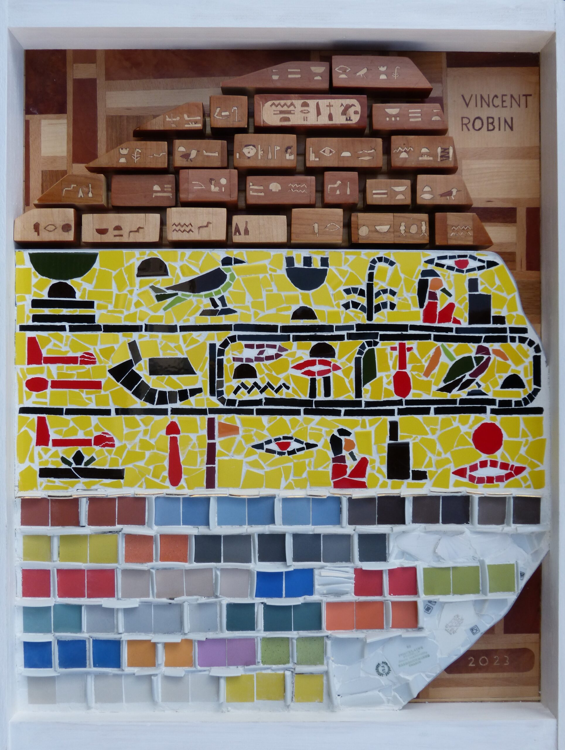 Passionné d’égyptologie, j’ai souhaité, comme sur la Pierre de Rosette, réunir trois époques de ma mosaïque : d’abord la marqueterie de bois que je pratique depuis plus de 25 ans, la mosaïque de faïence que j’ai découvert il y a 8 ans ainsi que la mosaïque contemporaine qui m’inspire aujourd’hui. Pour moi, au travers ces nombreuses techniques, la mosaïque est un art intemporel.